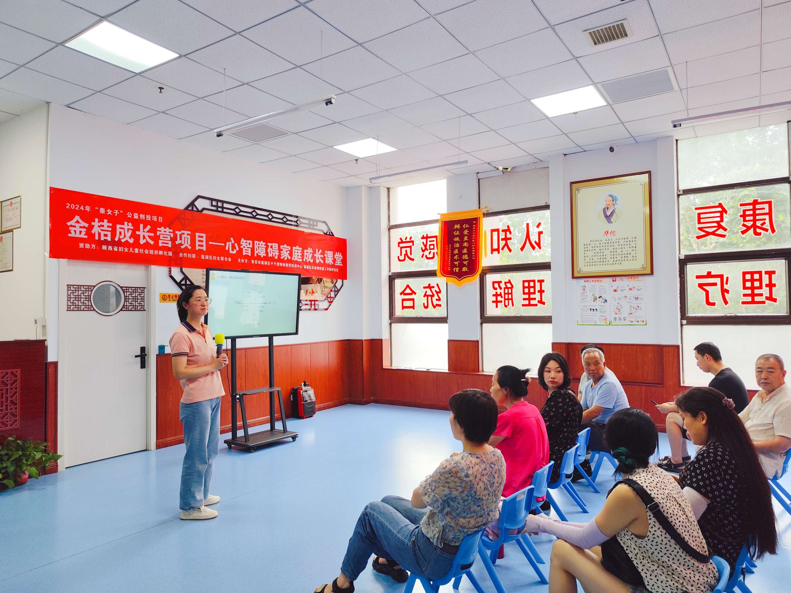 6月26日,由陕西省妇女儿童社会组织孵化园、湖南省鼎翰公益基金会资助,莲湖区妇女联合会支持,西安市莲湖区千千爱特殊教育培训中心、莲湖区红庙坡街道工农新村社区共同主办的“金桔成长营-家庭成长课堂:愉快地带着孩子生活”在千千爱特教中心顺利开展,来自西安地区的50多名家长参与了本次课堂。 本次家庭课堂以“愉快地带着孩子生活”为主题,结合心理学专业和日常教育教学中的实际案例,通过案例分享、角色互换体验、心理互动小游戏、家长分享,帮助家长了解和理解心智障碍孩子的世界与我们有什么不同,引导家长学会如何爱和支持孩子,促进心智障碍家庭建立良好的家庭氛围,缓解家长压力,促进亲子关系,陪伴孩子快乐成长。