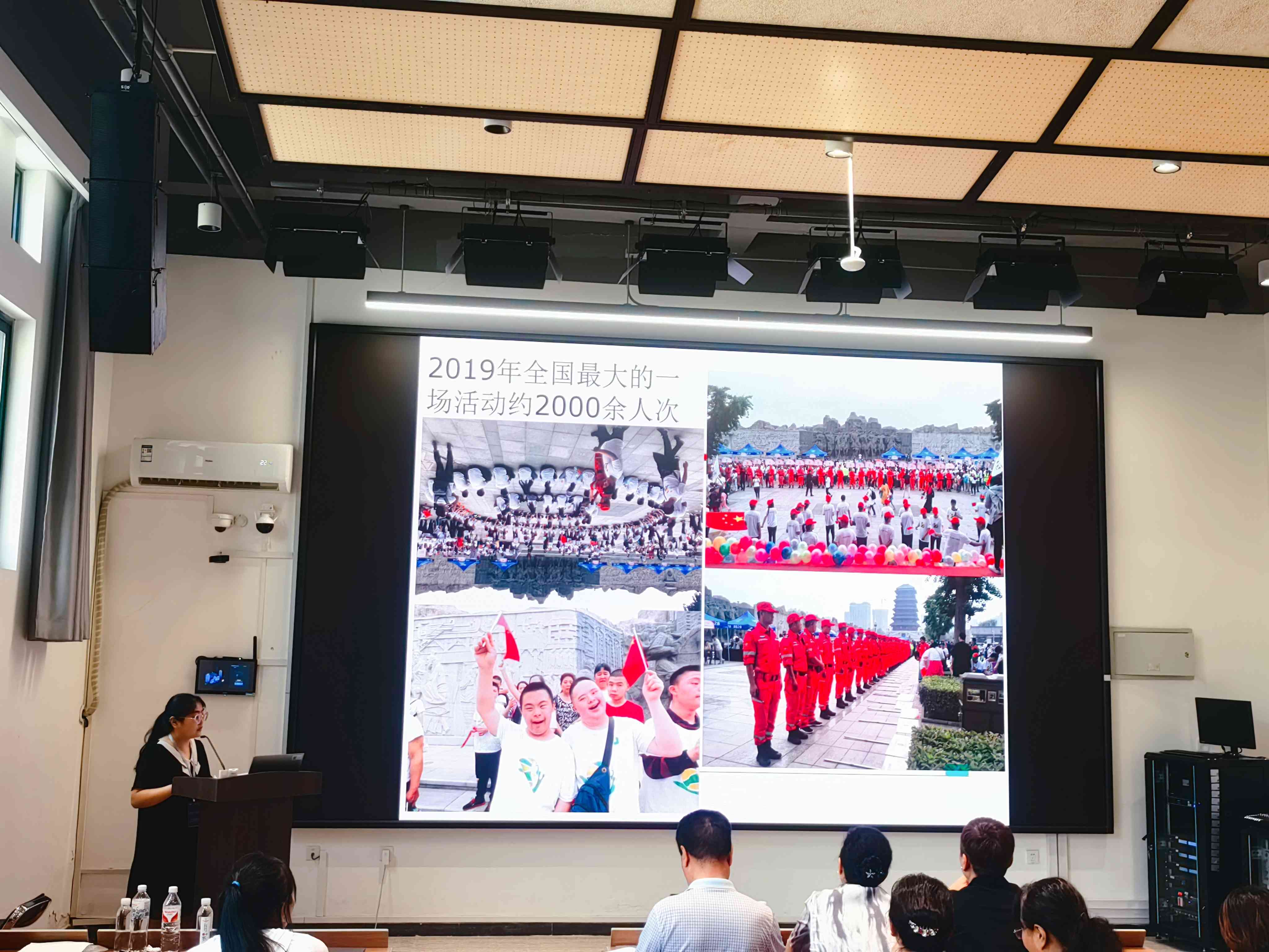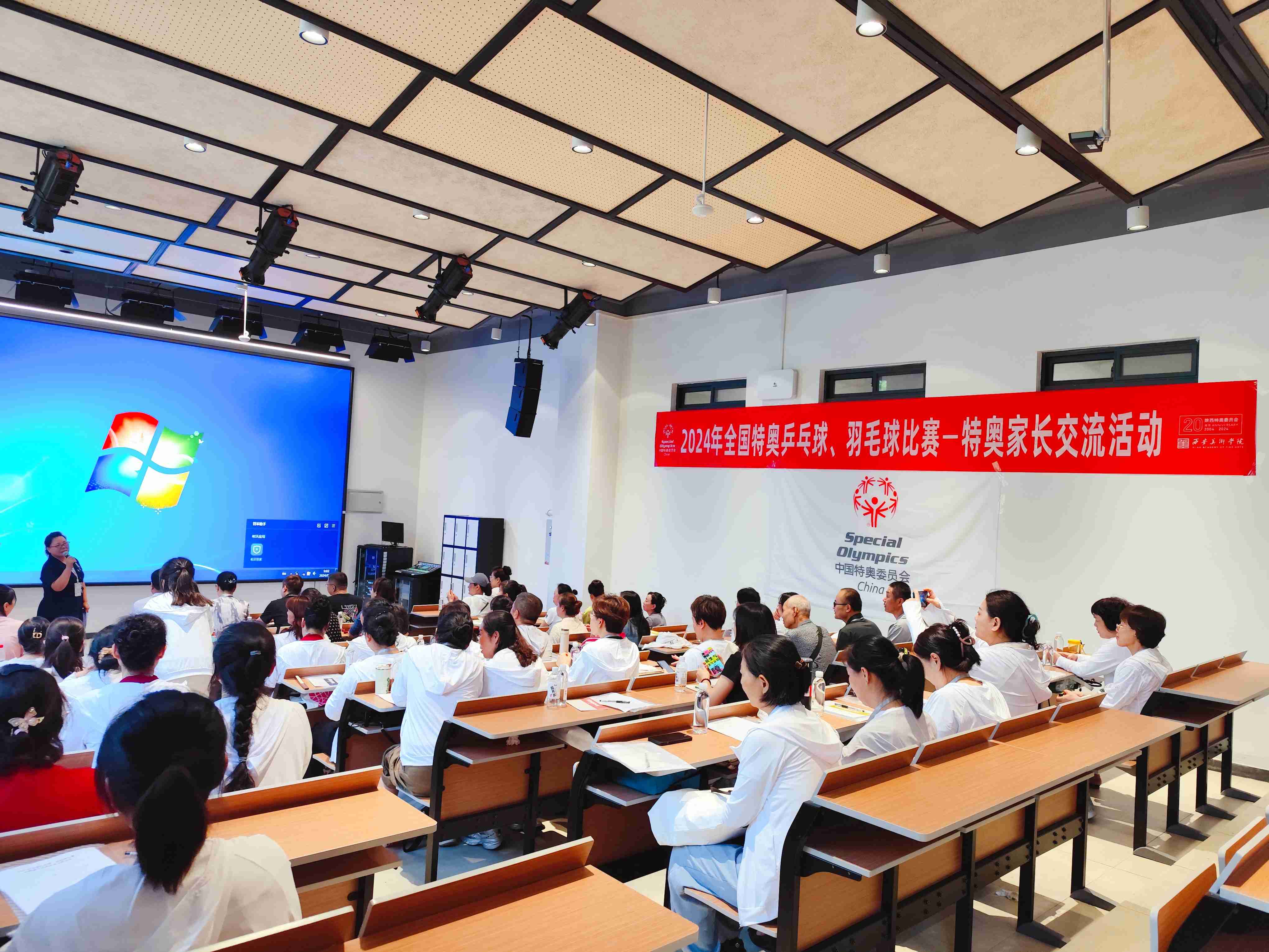 交流分享,共筑美好未来 交流活动开始, 首先陕西特奥委员会副主席刘洁分享走进特奥会,为大家介绍关于特殊奥林匹克运动的相关知识。特殊奥林匹克运动,简称“特奥运动”,通过参加特奥运动,智障人士可以增强身体机能、动作技能、自尊及自信,培养友谊以及得到家庭成员的支持。