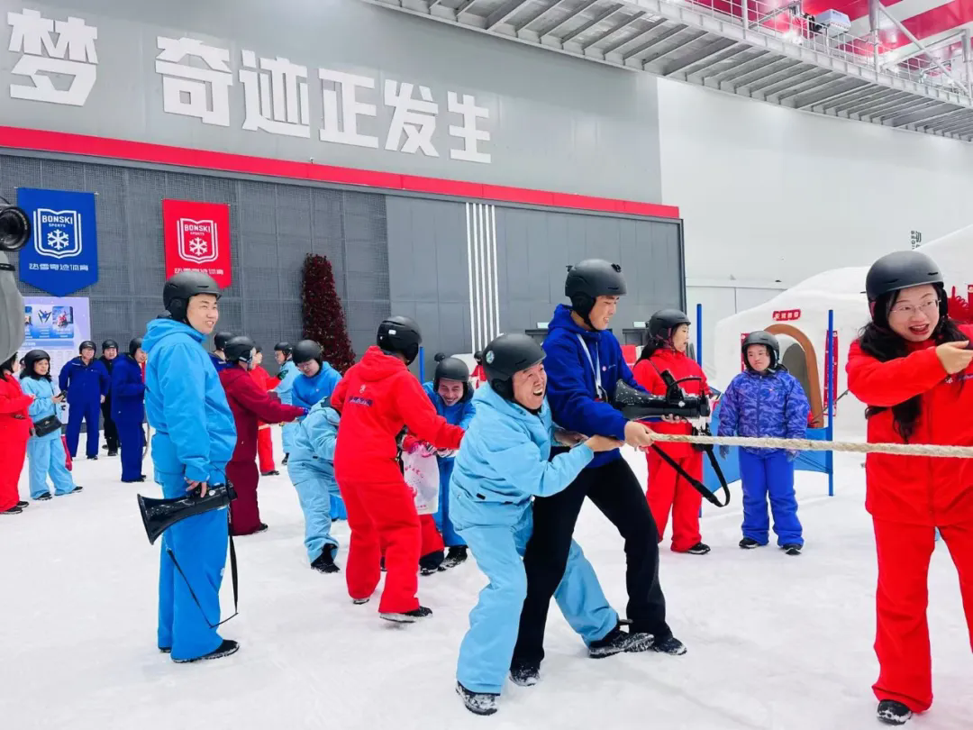 热雪奇迹西安研学中心为这次活动精心设计了兼顾安全性与趣味性五大仿冰雪运动项目:雪地拔河、龙舟竞速、接力赛、大作战、雪圈滑行。70组家庭分组协作,在专业教练与志愿者的引导下体验了冰雪运动的魅力,所有参与者相互鼓励、相互配合,在运动中懂得了团队协作的力量,家长们则亲身见证了孩子在融入社会的体验与突破。