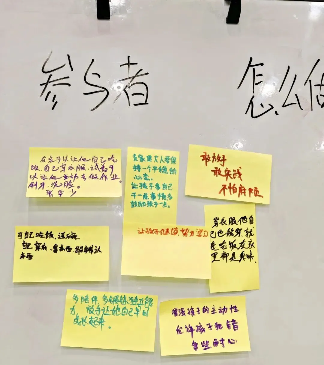 每一张小纸条,都是一个家庭迈向新起点的微小而坚实的坐标。其中,一句 “敢放手,敢实践,不怕麻烦” ,道出了无数家长最深处的突破与渴望,格外引人共鸣。它不仅仅是一个行为改变,更是一份内心宣言:我愿意用信任替代过度保护,用陪伴成长的眼光,看待可能出现的挑战。这些真挚的表达,让整个空间充满了自我觉察的勇气与积极改变的正向意愿。改变,就从这“一点点”的承诺开始。