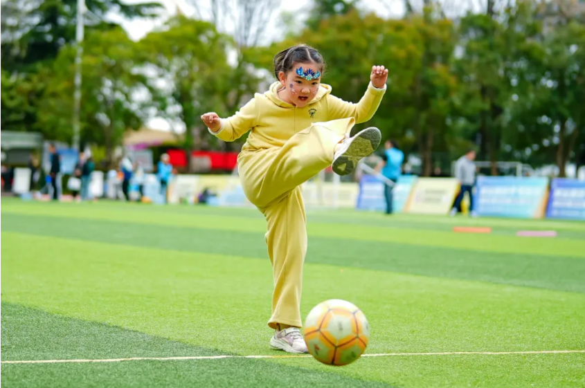 足球定点射门——在足球定点射门区,小小的球门前排起了长队。孩子们轮流站在指定位置,瞄准、抬脚、射门——球进了!欢呼声此起彼伏。