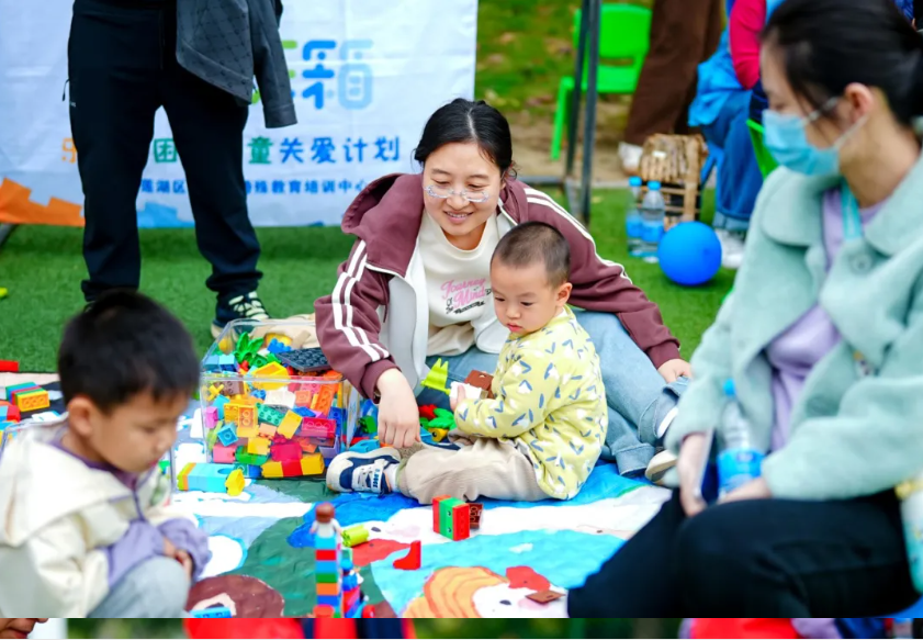 乐高拼搭——孩子们围坐在一起,小手忙碌地拼接积木,不一会儿,一座座小房子、小校园便在他们手中诞生。一名普通小朋友主动将自己拼好的房子推到旁边的特殊小朋友面前,说:“你看,我们一起搭了一个家!”两个孩子相视而笑,又一起埋头继续创作。