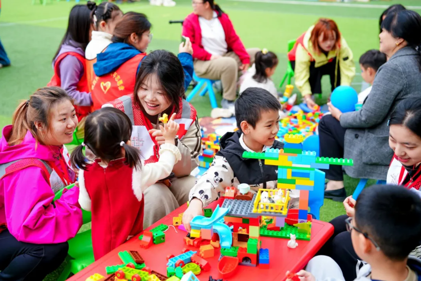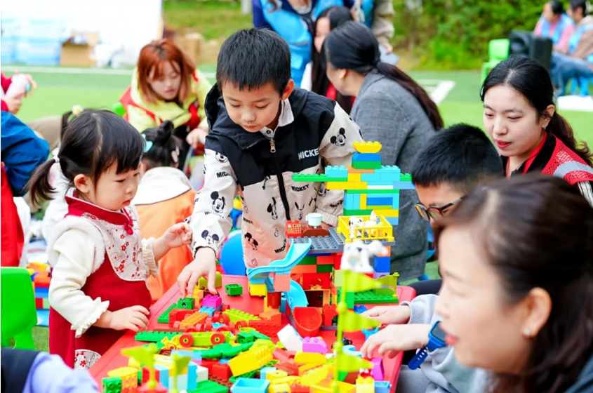 乐高接力赛——在乐高接力赛中,一名特殊儿童在组装乐高时突然乐高掉在地上摔散了,旁边的普通儿童立刻跑过去捡起乐高,轻声说:“我帮你捡,你来拼,我们一起!”两个孩子默契配合,很快完成了任务,击掌庆祝的那一刻,笑容在两人脸上同时绽放。