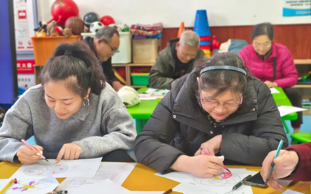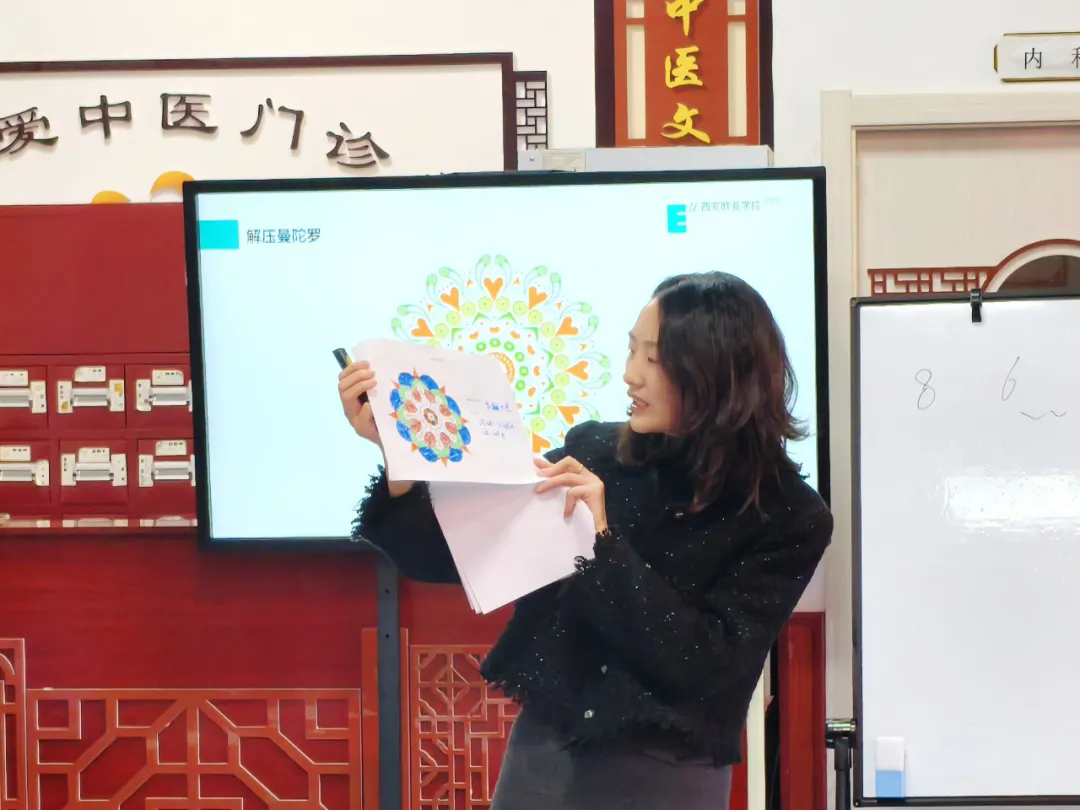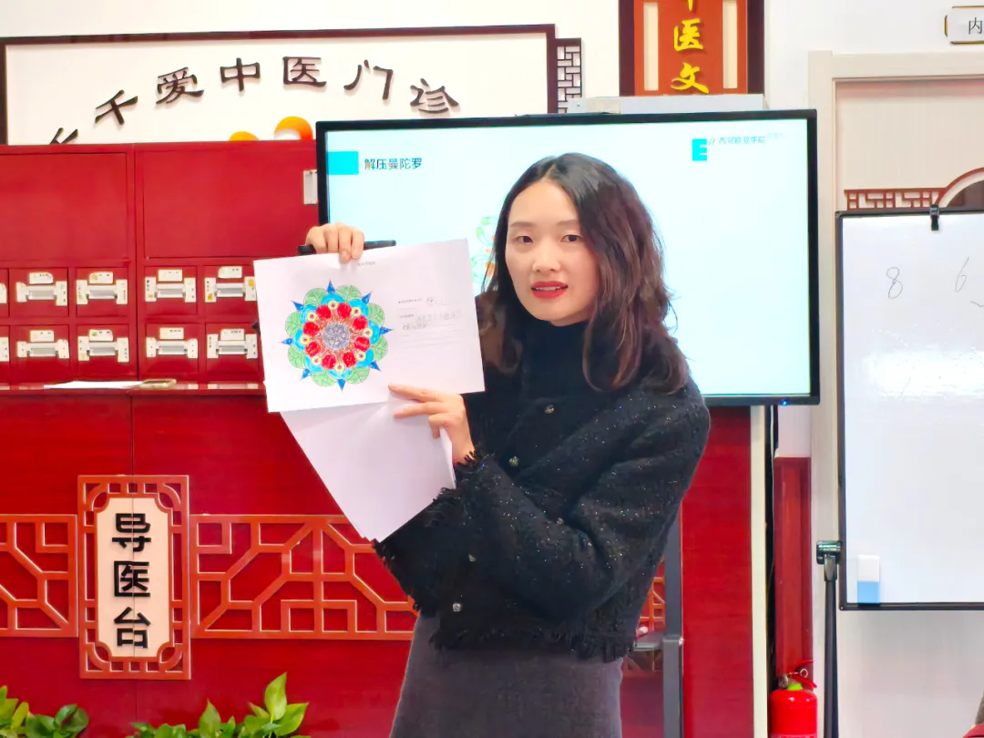“自我关怀” 活动的尾声,是专注于当下的宁静时刻。万老师给大家分发了曼陀罗解压图画,家长们沉浸在色彩的世界里,为图案涂上自己心仪的颜色。每一幅作品完成后,大家还为它命名,并写下当下的感受。