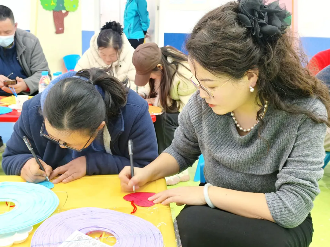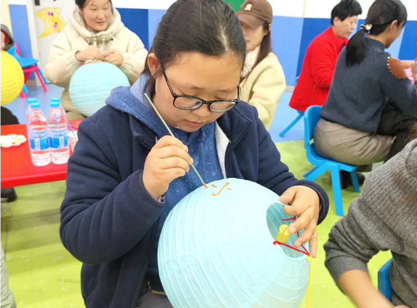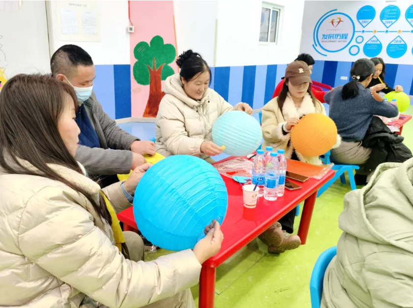 家长们专注地组装着灯笼,每一盏逐渐成型的灯笼都透着柔和的光晕,它们不仅是手工作品,更是理解与承诺的温暖象征,将在未来的日子里持续散发着温暖的光亮。