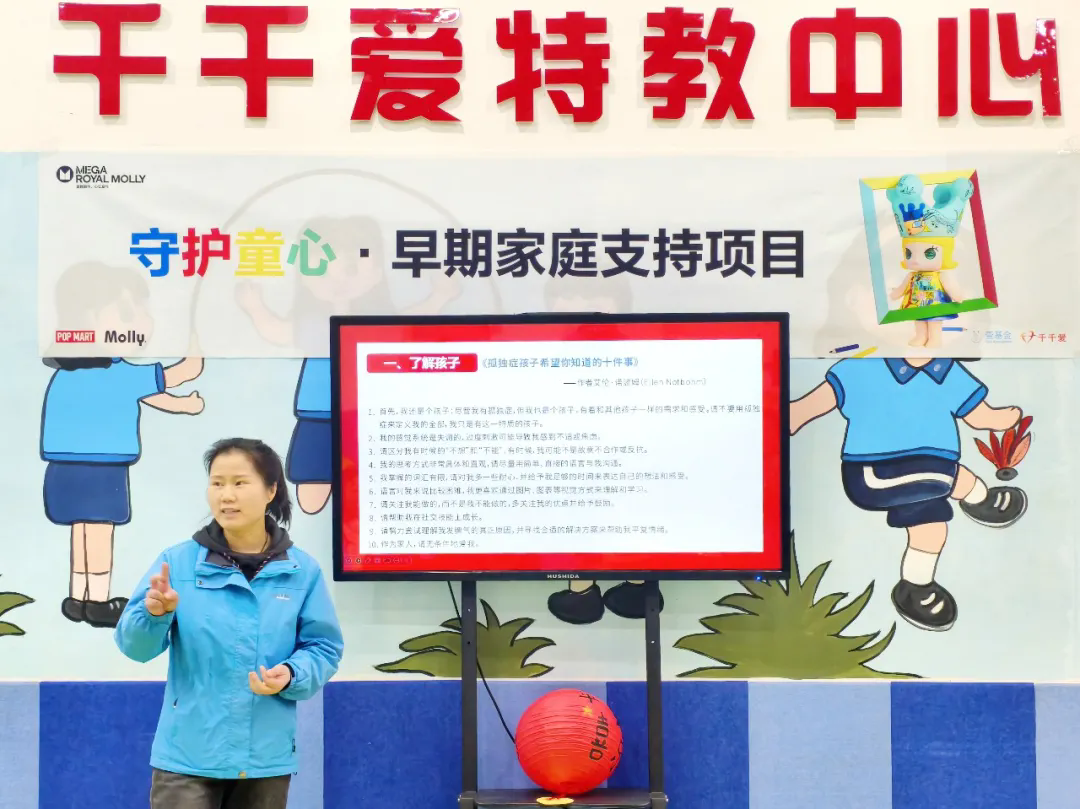 1月22日下午,在泡泡玛特的捐赠支持下,由深圳壹基金公益基金会发起、西安市莲湖区千千爱特殊教育培训中心执行的“壹基金海洋天堂计划-守护童心·早期家庭支持项目”第二期活动在西安开展。项目期望通过对2-9岁孤独症及发育障碍的儿童家庭开展赋能陪伴,协助家长应对养育过程中的各种挑战,从而支持孤独症及发育障碍的儿童尽早获得优质干预,最大化促进发展潜能。