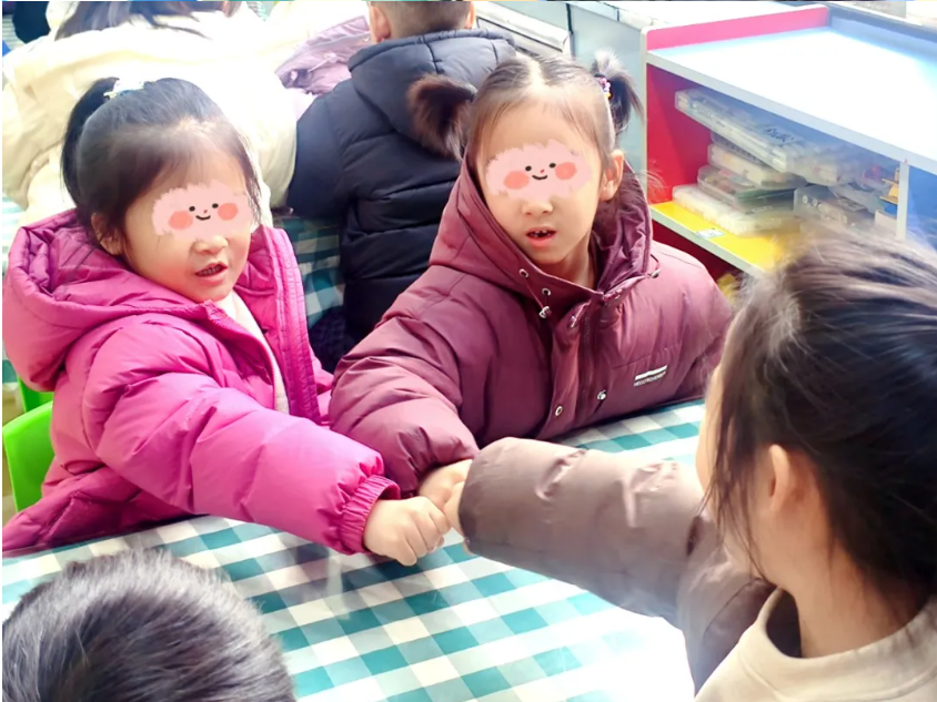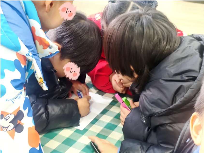 孩子们围成一圈,小声讨论,认真涂画,最后郑重地将纸条折起——那里面,有他们共有的“小宝藏”。讨论结束后雷老师对孩子们说:“现在,请守护好你们的宝藏,一会儿,我们要把它藏进‘宝藏基地’里。”