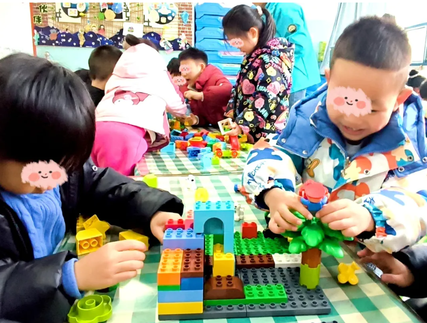 讲解完规则后,五个小组迅速进入了“建造状态”。教室瞬间成为一个热闹的“工程现场”: 第一组·迷雾森林 孩子们决定建造一个“谁也找不到”的森林迷宫。他们用绿色和棕色积木搭出高高低低的树木,用半透明积木制造“迷雾”,还在林间小径上设置了“陷阱机关”。宝藏被藏在一棵有红色标记的大树底部。“这里晚上会有猫头鹰守着呢!”孩子小声补充。