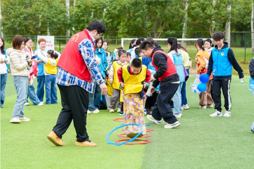 袋鼠跳跳赛——孩子们钻进彩色布袋,像小袋鼠一样蹦跳着完成往返赛道。有的孩子起初不敢迈步,在队友和志愿者的鼓励下,最终勇敢地跳向了终点。