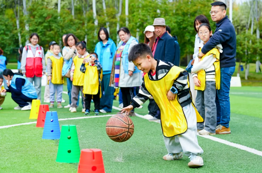 S弯运球赛——孩子们用脚运球,以S形路线绕过一个个彩色锥桶。控球、变向、加速,小小足球在脚下灵活穿梭,每一次成功过弯都赢得一片喝彩。有的孩子运球娴熟,如行云流水般绕过所有障碍;有的孩子球跑偏了也不气馁,捡回来继续挑战,在终点处收获属于自己的掌声。
