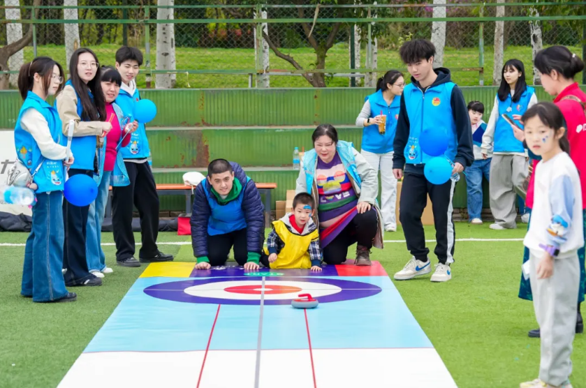 冰壶挑战——这个区则安静许多,却同样扣人心弦。孩子们俯身推出手中的迷你冰壶,眼睛紧紧盯着它在“赛道”上滑行。普通儿童和特殊儿童轮番上阵,互相支招、互相加油,小小的冰壶推来了大大的快乐。