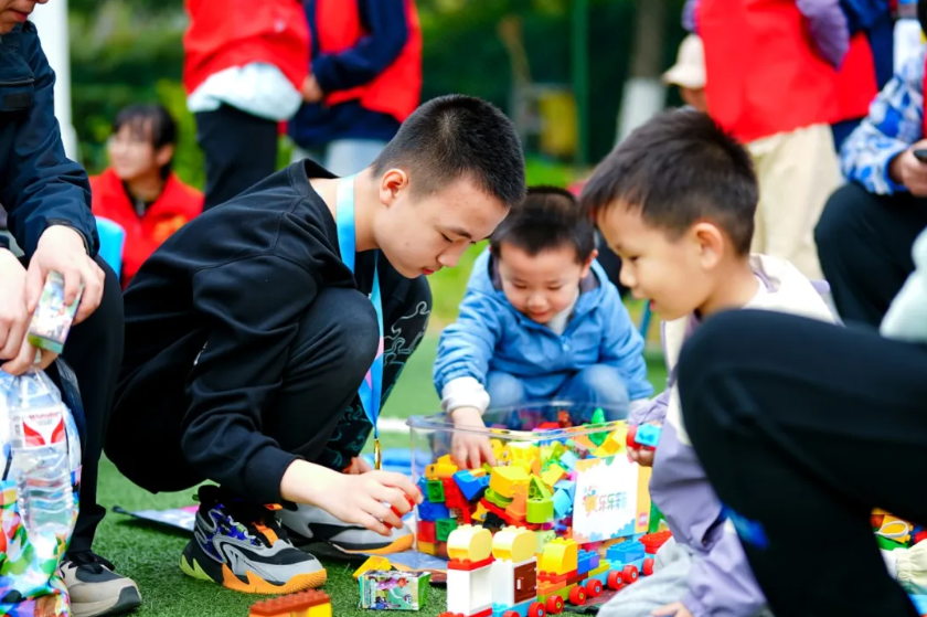 乐高接力赛——在乐高接力赛中,一名特殊儿童在组装乐高时突然乐高掉在地上摔散了,旁边的普通儿童立刻跑过去捡起乐高,轻声说:“我帮你捡,你来拼,我们一起!”两个孩子默契配合,很快完成了任务,击掌庆祝的那一刻,笑容在两人脸上同时绽放。