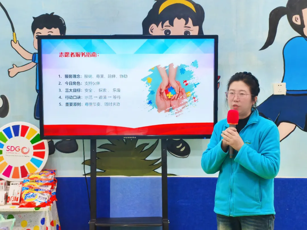 志愿同行,为爱助力 捐赠仪式后,千千爱的兰老师为志愿者们讲解志愿服务中的注意事项。从孤独症儿童发展特点到与心智障碍儿童互动的原则和技巧,从如何支持辅助孩子到如何表扬鼓励孩子……兰老师的指导让志愿者们更加明确了服务的方向,也为接下来的活动奠定了温馨而有序的基调。