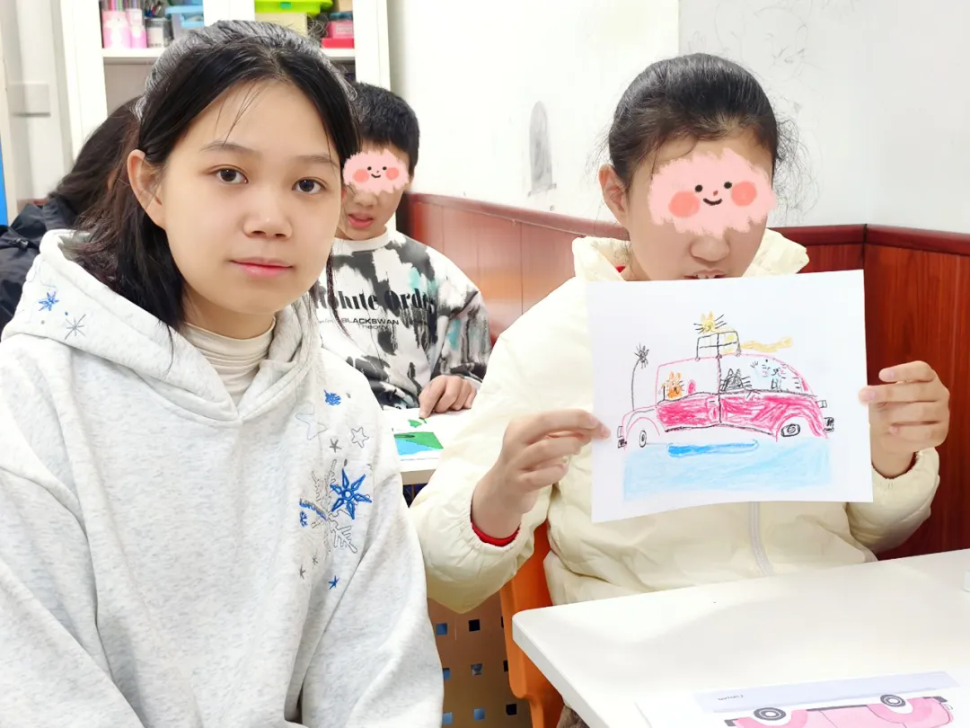 在选定样稿后,志愿者们坐到孩子们身边,一对一地耐心引导,鼓励他们在模仿的基础上加入自己的想象。原本空白的画纸渐渐被色彩填满,每一幅作品都在样稿的基础上生长出了独特的个性。这种从“参照”到“创作”的过程,既给了孩子们起步的支点,又保护了他们宝贵的想象力。
